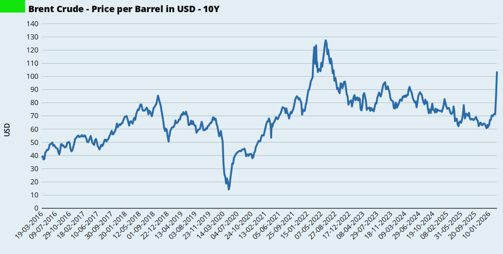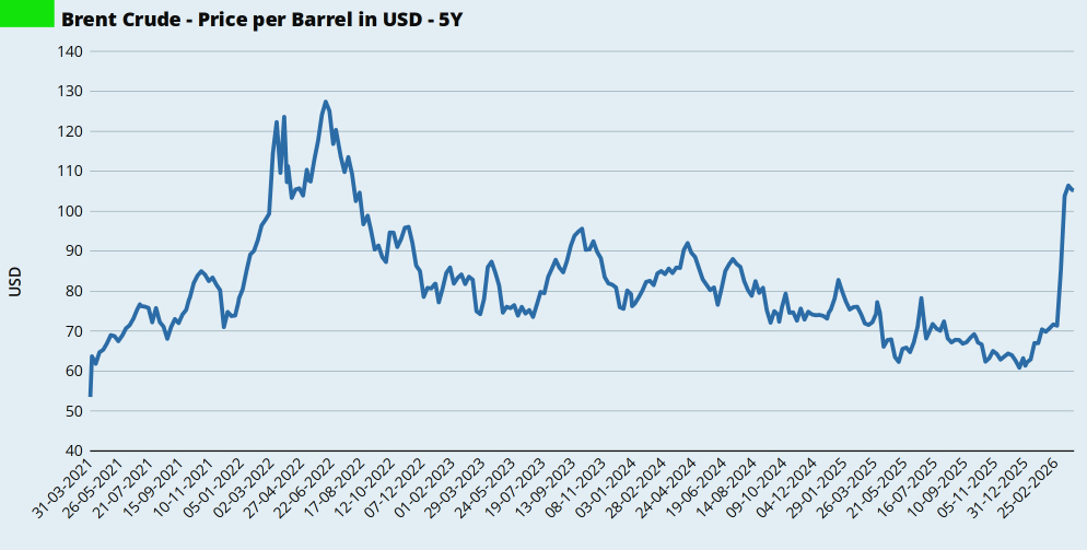 Het geklooi van de Verenigde Staten en Israël in het Midden-Oosten heeft er in elk geval voor gezorgd dat de olieprijs zich weer boven de USD 100 per vat beweegt. Een niveau dat we sinds 2022 niet meer gezien hebben. Met voorlopig Rusland als lachende derde, want de Verenigde Staten versoepelen de oliesancties tegen die andere agressor om de pijn op de wereldmarkt te verzachten. Tot zover de principes en het moreel kompas.