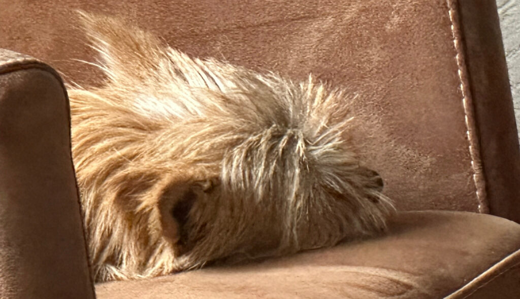 Ja, en onze werkdagen vindt ze niet leuk. Veel te lang alleen zijn. We doen ons uiterste best om dat te beperken tot maximaal twee dagen per week. Op mijn thuiswerkdagen ligt ze graag de hele dag op mijn schoot te slapen. Ze past precies op mijn schoot onder het werkblad. En dat is heel rustgevend, en daar profiteren mijn collega’s dan weer van.