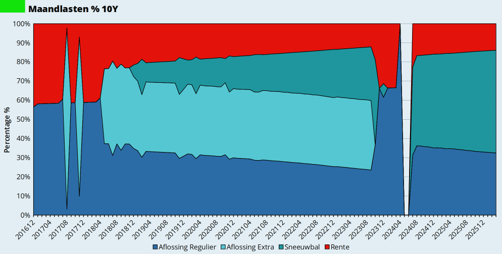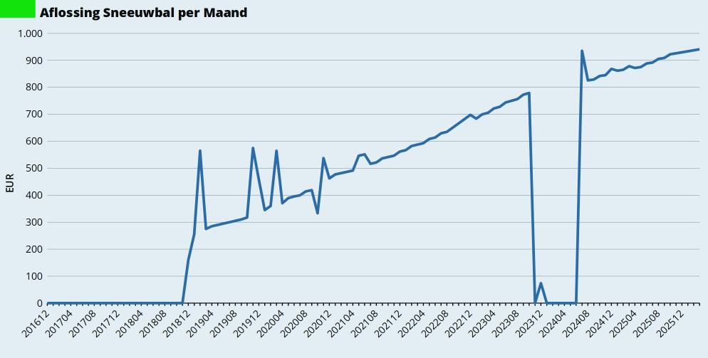 Inmiddels lossen we weer elke maand 1,07 procent van de resterende hypotheek af. Dat percentage stijgt gestaag, een jaar geleden was het nog 0,93 procent. En je ziet het verschil met de situatie tot eind 2023, toen we bij Huize Geldnerd naast de sneeuwbal ook nog een extra aflossing van € 1.000 per maand deden.