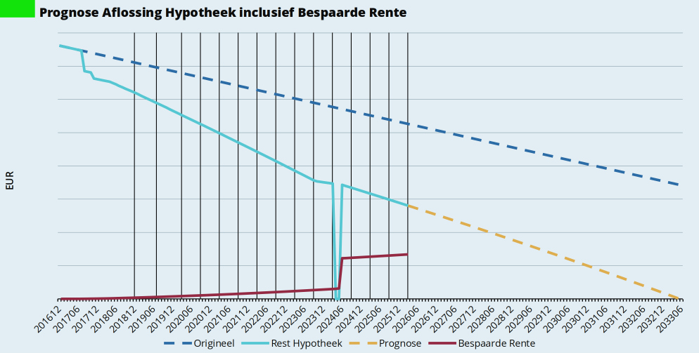Uiterlijk medio 2033 verwachten we hypotheekvrij te zijn. Dat is nog steeds ruimschoots voor het aflopen van de rentevaste periode, die loopt tot eind 2036.