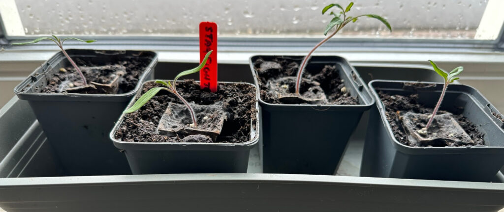 De tomaten hadden een meer dan moeizame start. Op 17 maart staken eindelijk de eerste tomatenplantjes hun kopje boven de grond uit. Zul je net zien. Op de dag dat mijn bestelde nieuwe zaadjes arriveerden, omdat ik niet meer geloofde in de eerste serie. Ik moet echt nog leren om meer vertrouwen te hebben in en meer geduld te hebben met de kracht van de natuur.