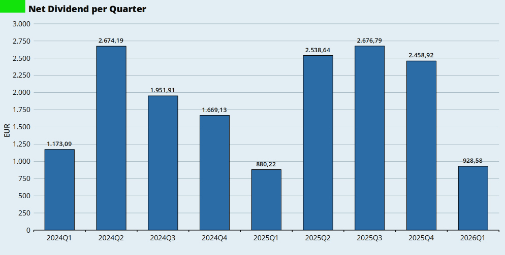 In het eerste kwartaal van 2025 ontving ik netto € 928,58 aan dividend op mijn rekening. In het eerste kwartaal van 2025 was dat nog € 880,22 en in het vierde kwartaal van 2025 ontving ik netto € 2.458,92.