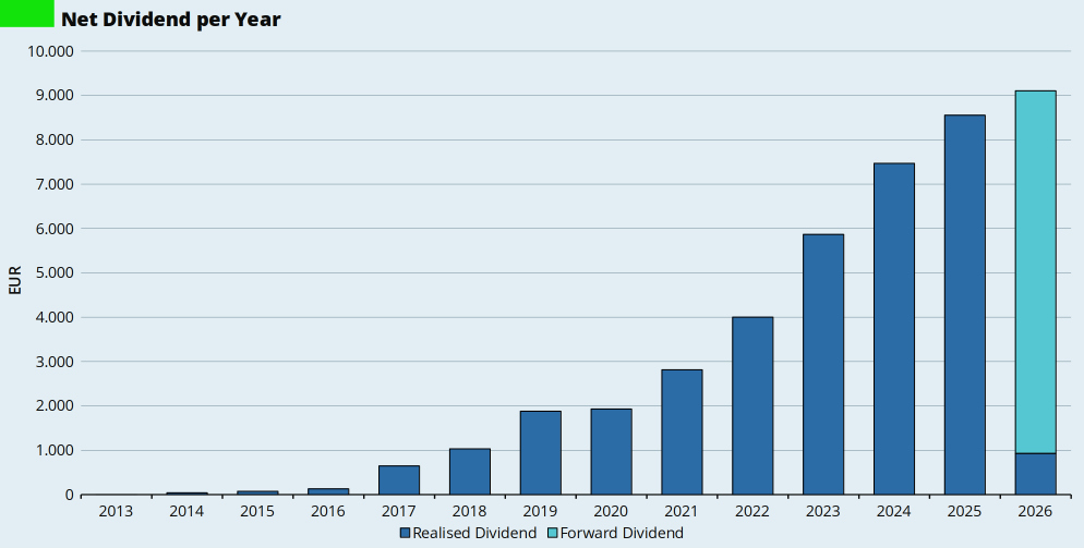 In onderstaande tabel zie je het netto ontvangen dividend in Euro’s per aandeel.