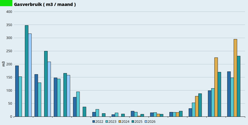 In onderstaande grafiek zie je ons gasverbruik per maand in de afgelopen jaren. In het seizoen 2025-2026 verstookten we in elke maand minder gas dan in het seizoen 2024-2025. In totaal verbruikten we dit stookseizoen 1.171,4 m3 aardgas. In het vorige seizoen was dat 1.360,4 m3.