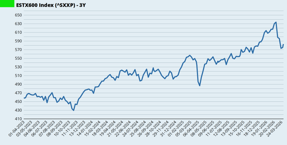 De Europese beurzen (die ik volg via de Eurostoxx 600 index) stegen in januari en februari lekker door. Maar ook ons continent werd meegesleept in de verwachte economische effecten van de oorlog in het Midden-Oosten. Bijna 10 procent ging er van de index af ten opzichte van de piek in februari. En we staan dus weer waar we vorig jaar november ook stonden. Het mag eigenlijk geen naam hebben.