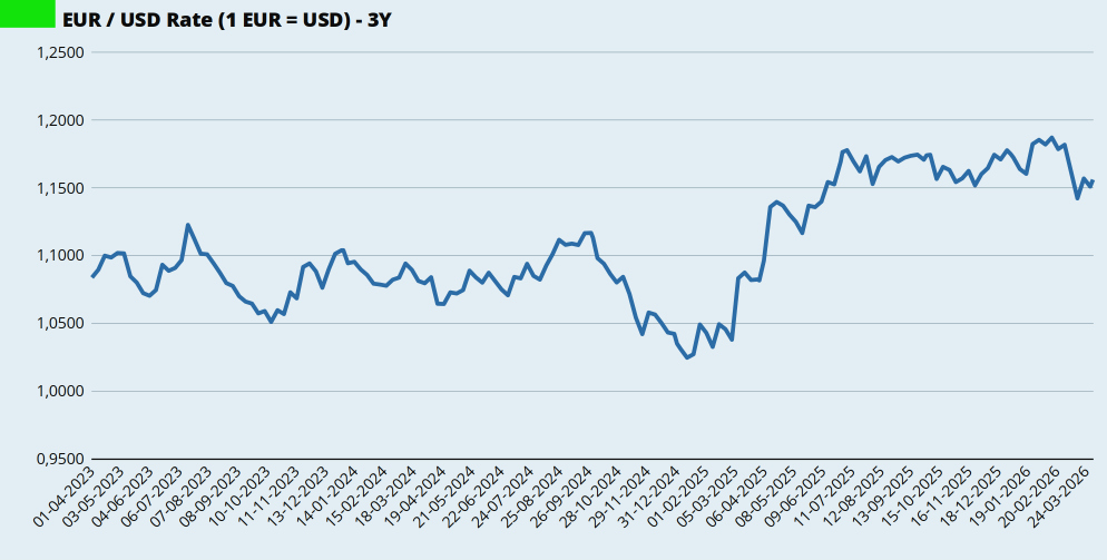 En zoals gebruikelijk ook een blik op de dollarkoers. Vorig jaar is de dollar behoorlijk verzwakt, van USD 1,03 per Euro naar USD 1,175 per Euro. In januari ging de daling van de dollar gewoon door. Aan het einde van het eerste kwartaal van 2026 kreeg je voor € 1,00 ongeveer USD 0,156. Dat is dan wel weer naar de zin van Oom Donald, het maakt de Amerikaanse export goedkoper. Niet dat ze daar nog veel maken dat we interessant vinden…