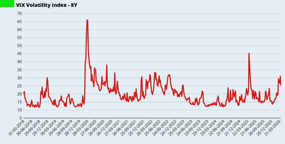 Dan de VIX-index, ook wel bekend als de Fear Index, de maatstaf van volatiliteit in de Amerikaanse markt. Die ging sterk omhoog na de aanval op Iran, dat zal je niet verbazen. Anno 2026 wordt de economie nog steeds geraakt als de productie en het transport van aardolie verstoord worden. Maar de VIX zit niet in paniek-modus. Nog niet.