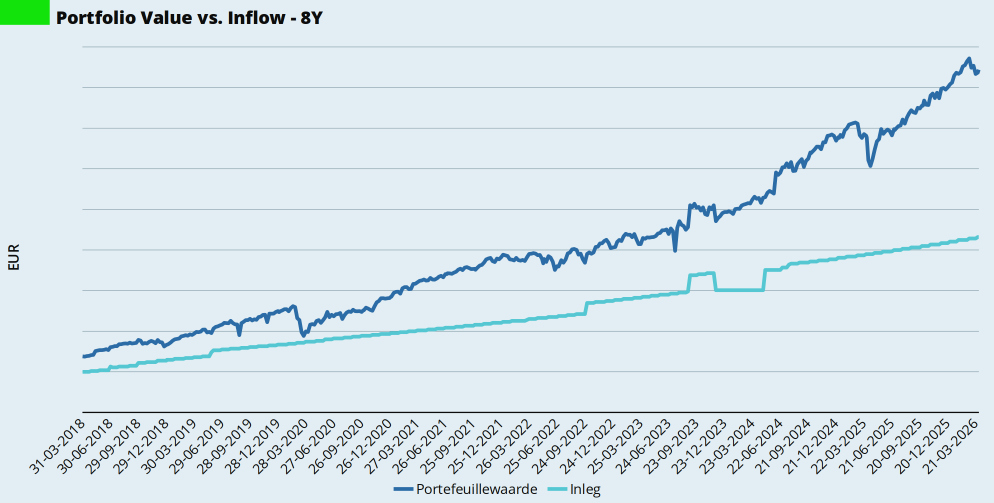 Deze grafiek toont mijn totale inleg, die nog steeds elke maand een stapje omhoog maakt, en de beweeglijke waarde van mijn beleggingsportefeuille. Zolang de waarde hoger is dan de inleg, is er niks aan de hand. En mocht de waarde ooit lager worden dan de inleg, dan is er ook nog niks aan de hand. Ik heb nog een lange beleggingshorizon.