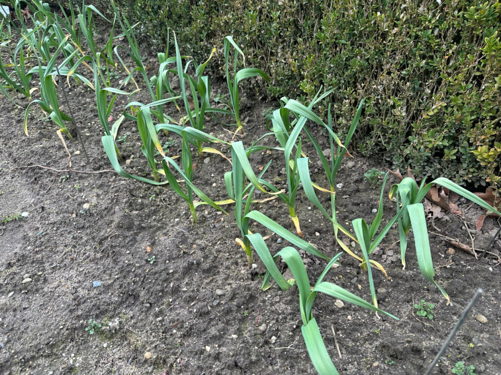In het najaar heb ik knoflook geplant. Die lijkt de winter goed doorgekomen te zijn. Het zal nog een maand of vijf duren voordat er iets te oogsten valt, ik ben benieuwd hoe dit zich de komende maanden gaat ontwikkelen. En misschien was het inderdaad wat veel om 75 knoflooktenen in de grond te duwen. Ze zijn namelijk allemaal opgekomen…