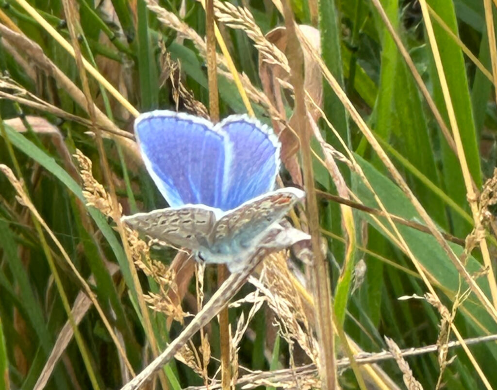 Ik maakte onderstaande foto’s van het icarusblauwtje. Een vrij algemeen voorkomend mooi klein blauw (je verwacht het niet met die naam) vlindertje. Die geduldig voor mij poseerde en zelfs de vleugels even open en dicht vouwde. Zodat ik een paar (in mijn ogen) mooie foto’s kon nemen.