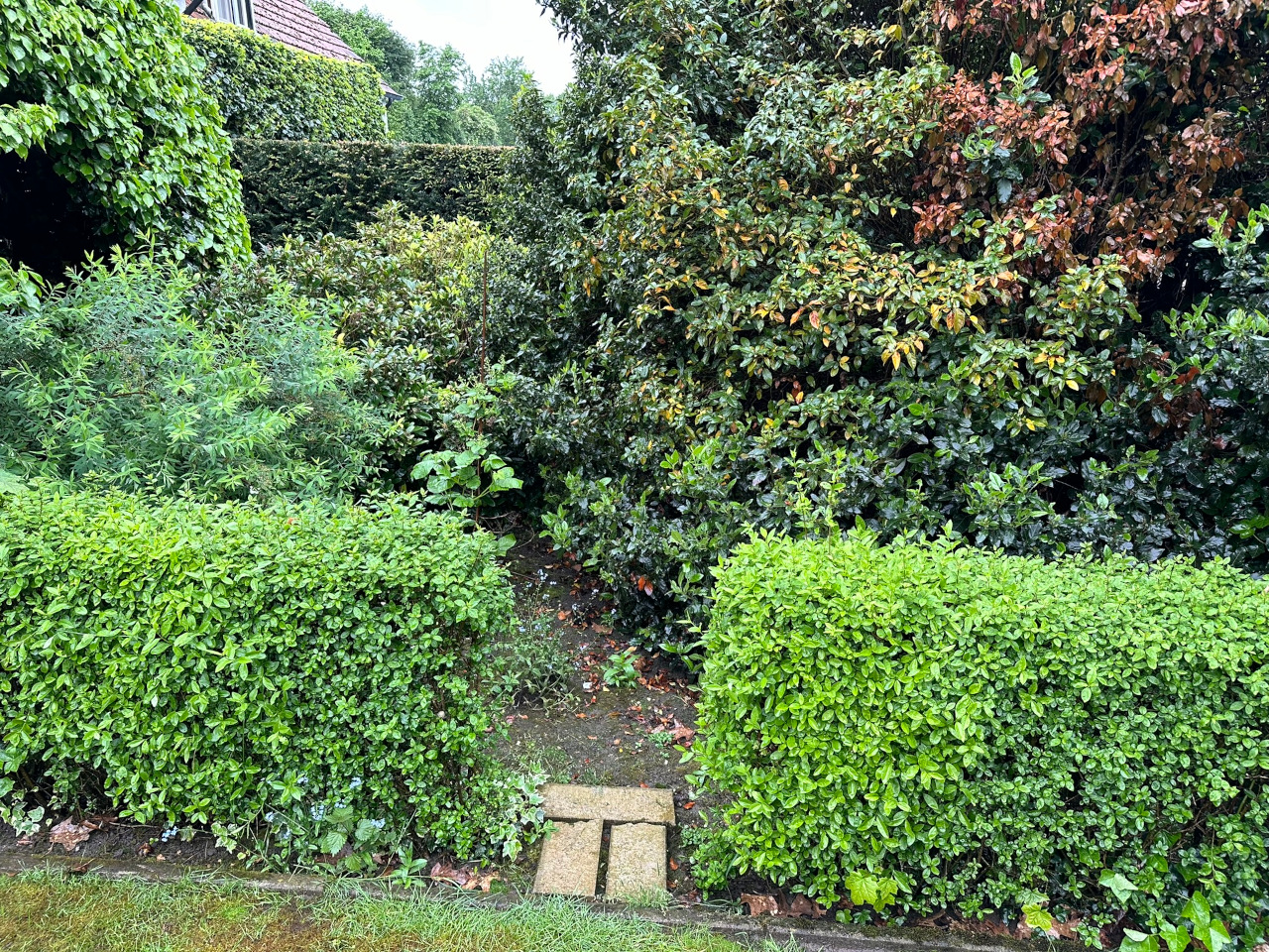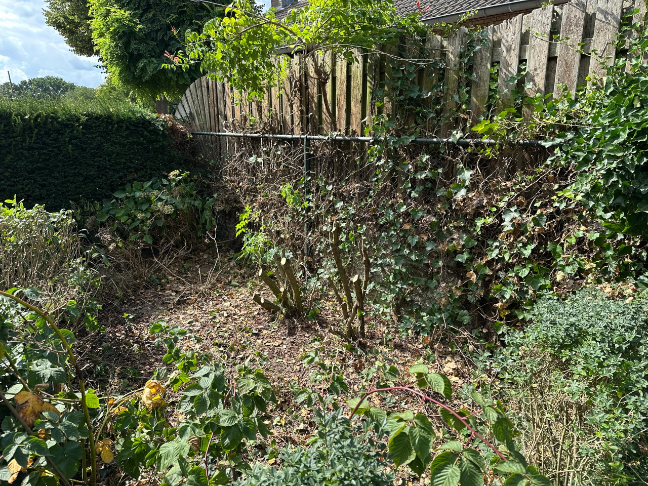 Voor mijn kas bevindt zich een woest begroeid stuk tuin. Hoge struiken, veel klimop. Duidelijk jarenlang genegeerd. Ik zie het als een mooie potentiële uitbreiding van mijn moestuin.