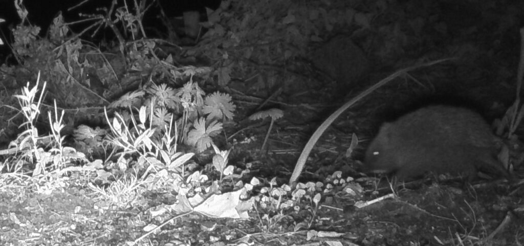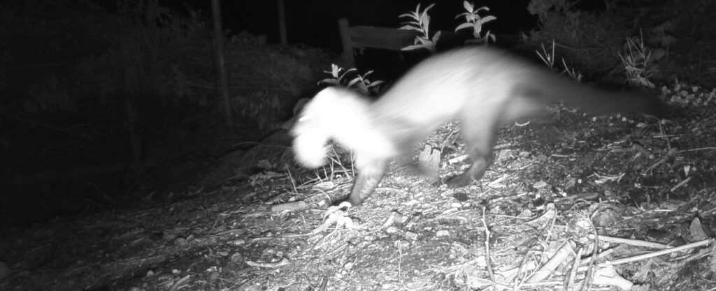 De afgelopen dagen en nachten heeft de camera toezicht gehouden op de composthoop. Dat leverde onderstaand nachtelijk beeld op. Niet de beste kwaliteit, uit deze en enkele andere foto’s bleek dat het sujet in kwestie haast had. Dit is de beste minst slechte foto. Het lijkt een marter, met een prooi in de bek.