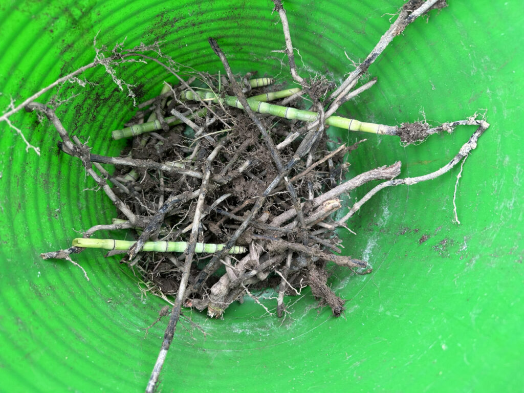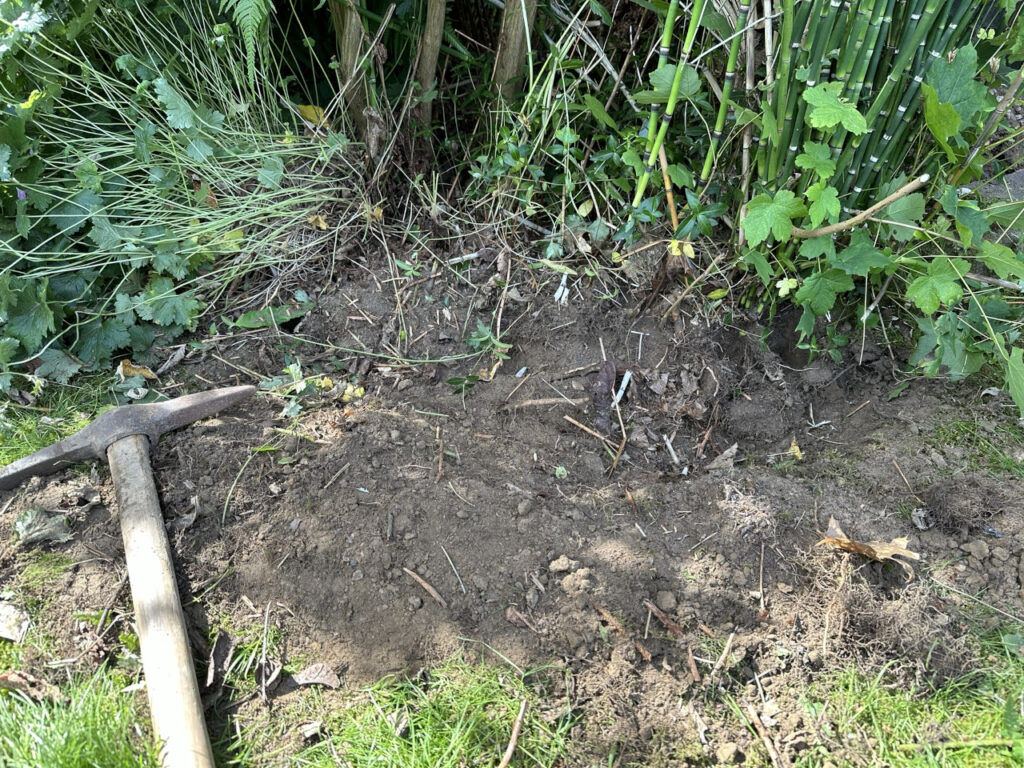 En ik had het nodig. De oorspronkelijke kern bamboe (codenaam Bamboe One) had een monsterverbond gesloten met een uit de kluiten gewassen varen. Voor de kenners: taai, dicht wortelstelsel. Met snoeischaar en takkenknipper ging ik het bos te lijf. Een spade werd ingezet. En uiteindelijk was er een pikhouweel nodig om de wortelstelsels onder bedwang te krijgen.