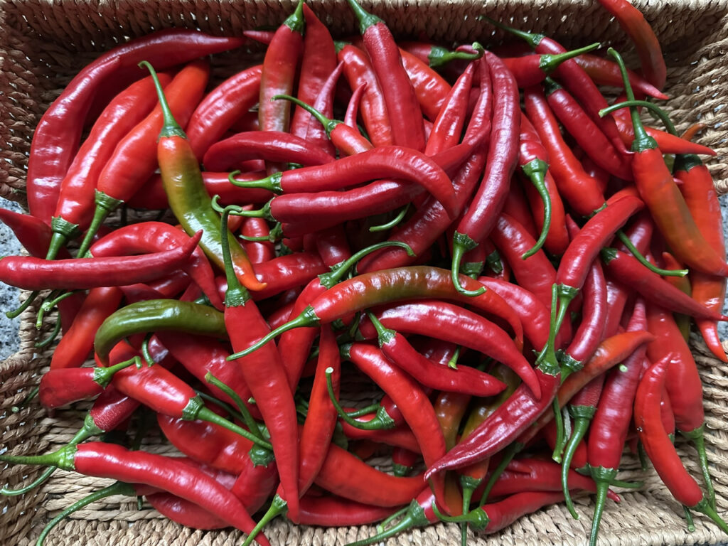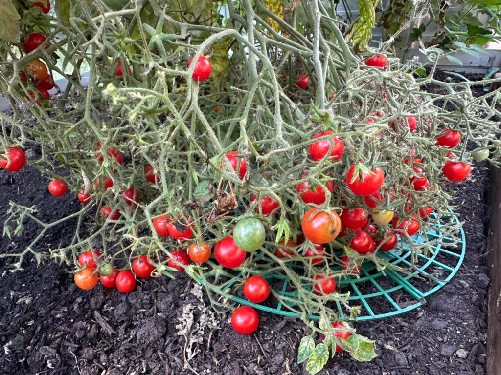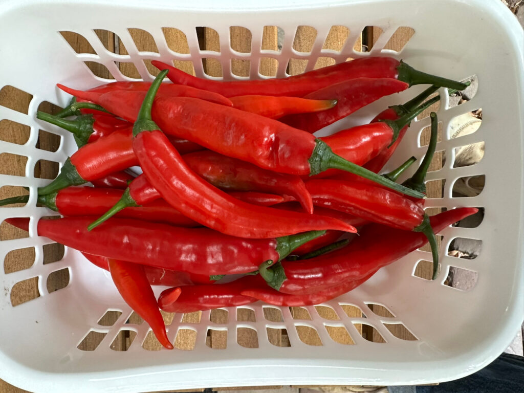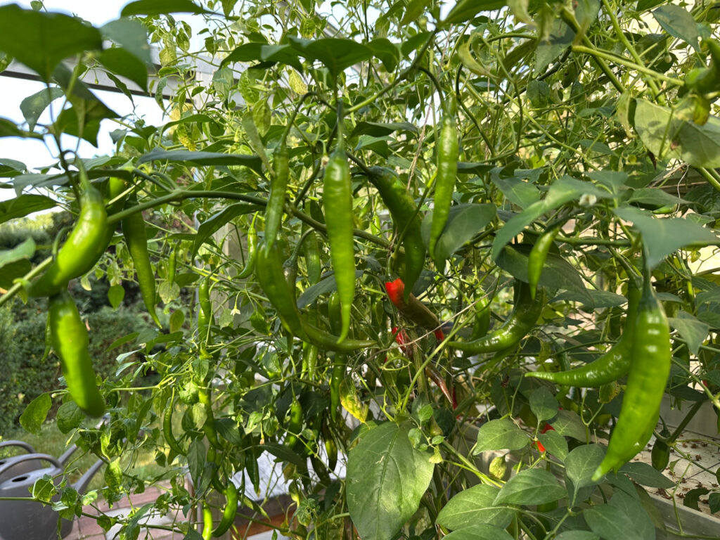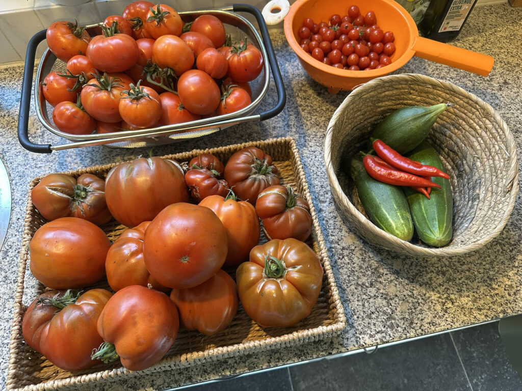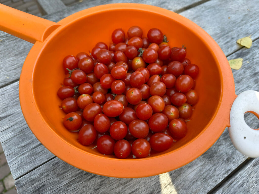In oktober zijn de laatste honderd pepertjes rood geworden. Heel veel rode pepers. Ruim een kilo ging er de diepvries in, en ik gaf ook nog het nodige weg. Er kwamen ook nog wat cherrytomaatjes uit de kas. Beduidend minder zoet dan eerder in de zomer want minder zon) maar nog steeds heel smakelijk. Er staat ook nog kropsla in de kas.