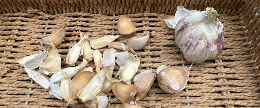 Iets nieuws de grond in? In oktober? Jawel! Ik kocht een aantal knoflookbollen bij mijn favoriete zadenwinkel, en duwde de tenen de grond in. Germidour, een modern ras in de traditie van de Franse Violet de Cadours, met een stevige smaak. Als alles goed gaat eten we vanaf de zomer van volgend jaar alleen nog maar eigen biologische knoflook.